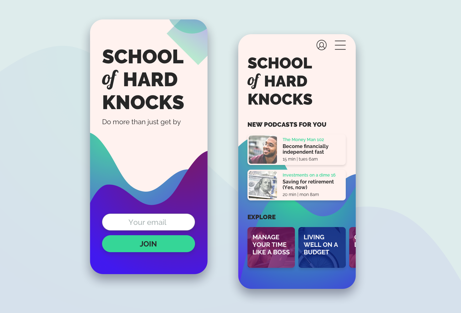 It’s not your imagination: adulting is really hard these days. For every Boomer complaining about iPhone-obsessed young people, there’s a college grad struggling to make ends meet in a stagnant economy, navigating a volatile job market, and trying to make heads or tails of their shaky financial future. The School of Hard Knocks is concept I designed around helping this generation learn the tools for financial literacy and independence via courses, podcasts, and a mentor network.